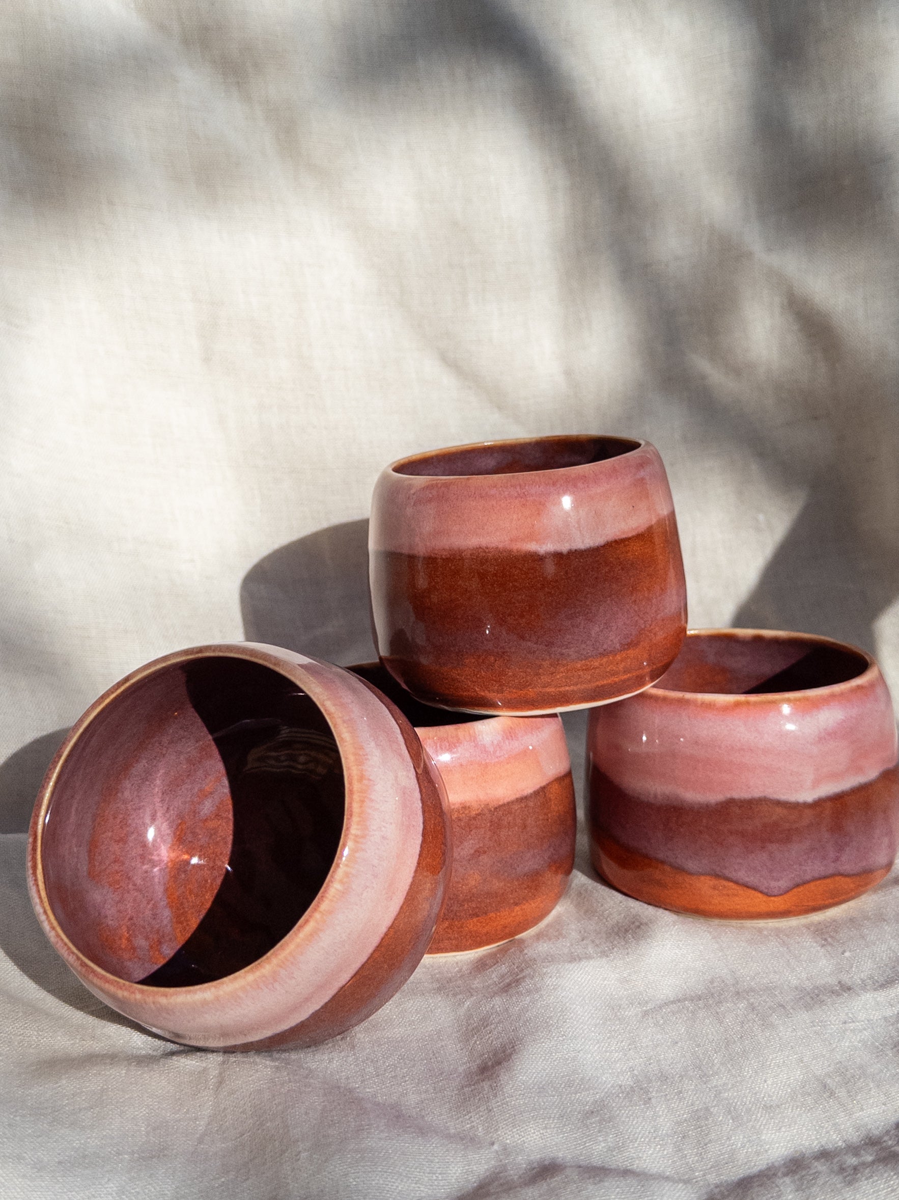 A warm pink wave rolling over an earthy red purple this handmade cup is perfect for a cup of tea or a warm matcha!